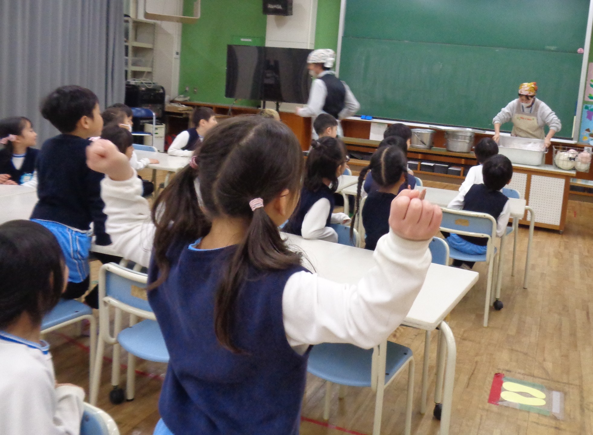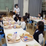 体験給食では、小学校の栄養士の先生に野菜について教えていただいたり、小学校の先生方に、配膳のしかたや