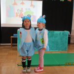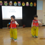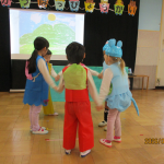 劇は、“おむすびころりん”のお話をアレンジして、友達と力を合わせてつくりあげました。年長児は、ナレーターをしたりや一人でセリフを言ったりしました。年中児は、友達と一緒に表現することを楽しみました。