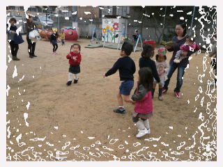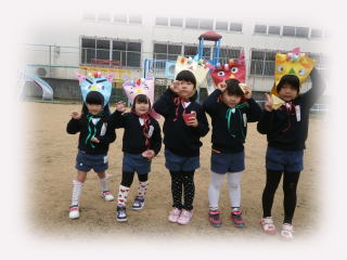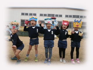 子ども達は、思い思いの鬼の面を作って、豆まきをしました。今年は、わくわくダック(3歳児体験保育)に参加している子も一緒に仲間入り。