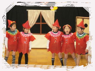 6年生がミニ見に発表会に園児を招待してくれ、英語劇を見せてくれました。「おむすびころりん」「桃太郎」