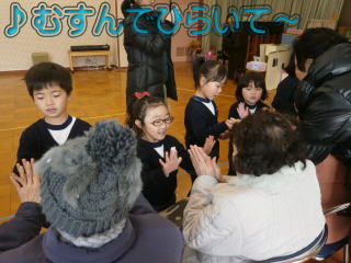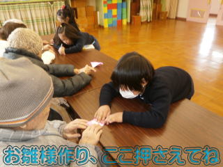 「むすんでひらいて」のふれあい遊びや、「おひなさま」を一緒に作りました。どうしたら喜んでもらえるのか、子ども達なりに考えて活動していました。
